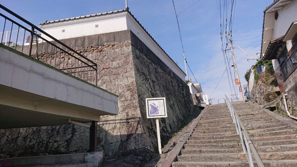 こちらは、同じく豊後高田市の藩政時代の石段と石塁ですが、隣地のお屋敷のベランダに物干しがあり、洗濯物が干してある様だったので、カメラを向ける方向は気を使いました。城跡と一般住宅が隣接するときは、住民の方に不快な思いをさせないように気を付けなければなりません。