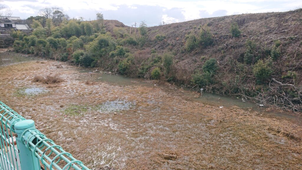 この写真は、市道側から撮影した豊後高田城の水堀と土塁の跡です。水面は水草が繁茂し、ゴミもたくさん浮いておりました。池状の堀水も滞留しており害虫の発生など生活環境面では大丈夫かと余計な心配もしてしまいます。