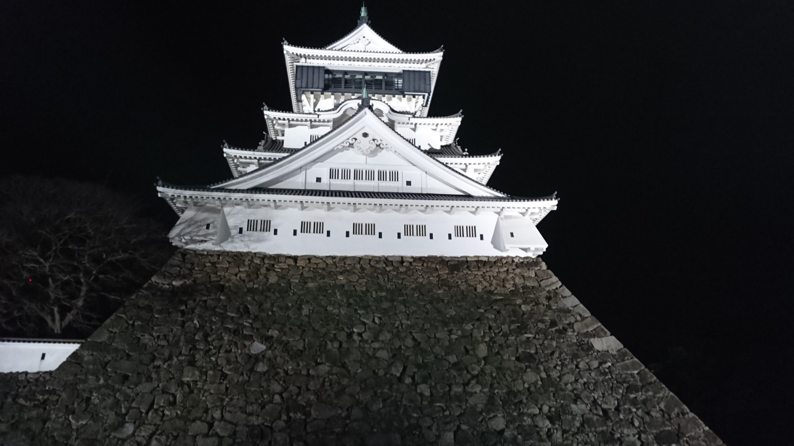 写真は平面的に見えるのでわかりにくいと思います。石垣隅部からの建物と石垣の接合部が曲線を描いているように写っています。しかも真ん中あたり外壁が少し、石垣がはみ出しています。天守台が歪みをもって築かれていることがわかると思います。