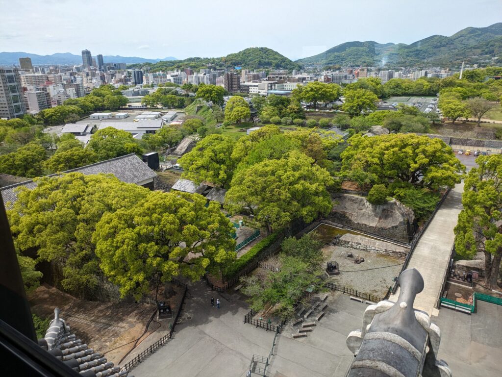 熊本城は広さは約98ヘクタール(約98万m2)、周囲は約5.3kmあります。これだけ広いのは、南西の「古城」と北東の「千葉城」を取り込み、それらを出丸としているのも一因です。古城と呼ばれているエリアは名称の通り、熊本城の前身である「隈本城」があったところです。古城は熊本城の南端にある南北に細長い台形の郭で、鹿子木親員が室町期(16世紀前半)に隈本城として築城した場所であり、その後もこの場所を佐々成政や加藤清正も肥後統治の拠点としていました。豊臣秀吉が九州征伐の道中で隈本城を名城と評価していることから肥後統治に相応した城が存在していたことが伺われます。加藤清正が入部した時の地図では坪井川沿いに三層の天守(他に二層の櫓二基)あったということで、佐々成政が城主の一年足らずの内に織豊系城郭として整備していたかもしれません。