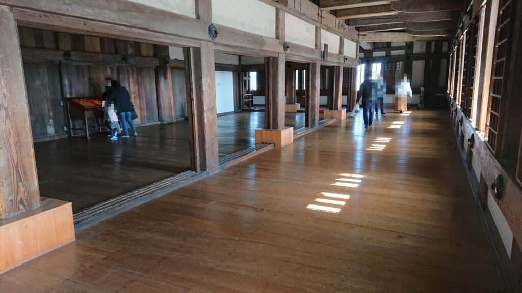 天守の外壁に沿った廊下状の空間。「武者走り」ともいう。身舎(もや 母屋)の欄の画像をみてね。