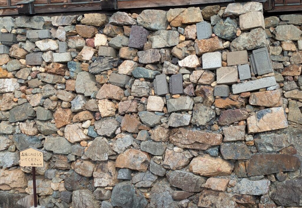 特に注意してみると、仏像の一部や文字が刻まれた石が使われているものもあり、通常の石垣とは異なる独特の表情を感じることができます。