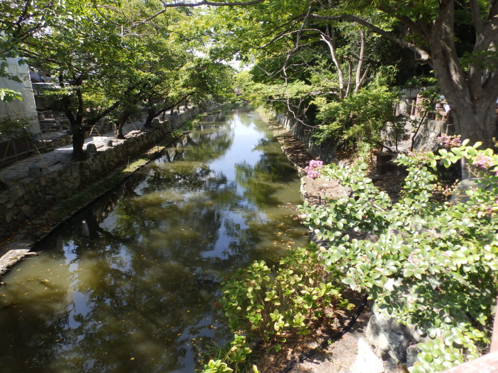 鉄道を乗り継ぎ、JR近江八幡駅で下車、駅前のレンタサイクル屋さんを探して今日一日の愛車をゲットしました。(確か500円だったと思います)まずは八幡山城を目指します。ところで、借りる時に今更思ったのですが、私は実は30年以上自転車のハンドルを握った記憶がありません。最初は勘が戻らず、結構危なっかしいハンドルさばきで店舗を出たので、見送りのお店の方を心配させたかもしれません。なるべく最短距離を走り、10分くらいで城内と城下を隔てる八幡堀という観光スポットまで来ました。城跡のロープウエー駅はもう目の先にあります。
