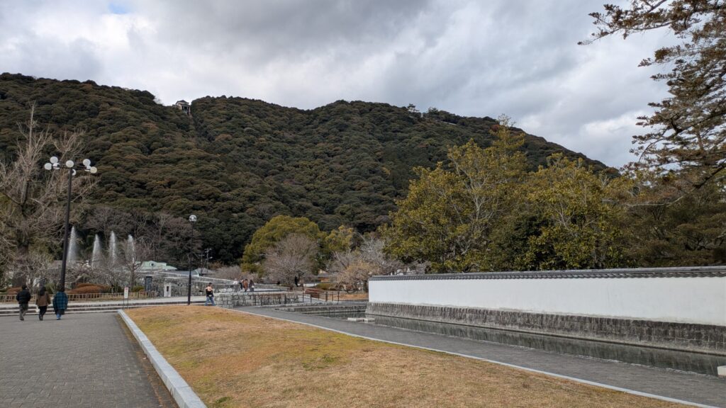 錦帯橋から徒歩で13分くらいでロープウェイ駅に着きます。岩国城へ向かうには、錦帯橋を渡り、吉香公園内にあるロープウェイにのって城山山頂へ移動後に天守に向かうのが一般的なコースになっています。錦帯橋+ロープウェイ(往復)+岩国城で別々に料金を取られますので、セット料金がお得となっています。(2025年12月現在 大人 セット割引券 970円 子供460円 錦帯橋入口券売所で購入できます)