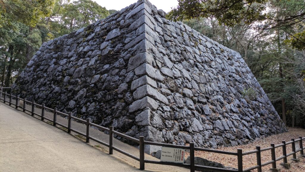 私が訪問した岩国城天守は、資料に基づいて再建された復興天守です。再建された位置も眺望のために過去存在した場所から数十メートル離れていますが、天守を載せていた石垣(天守台といいます)が現地に残されており現地で見学することが可能です。