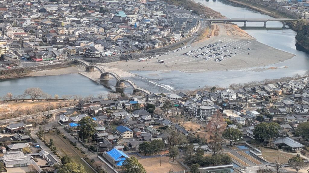 最上階の展望室は四方を廻れますが、錦川が城のある横山を三方向からシロヘビがとぐろを巻いているように囲っているのが確認できました。つまり川が防御ラインでお堀の役割を果たしているということです。山と海と川と城下町が織りなす風景は価値があります。