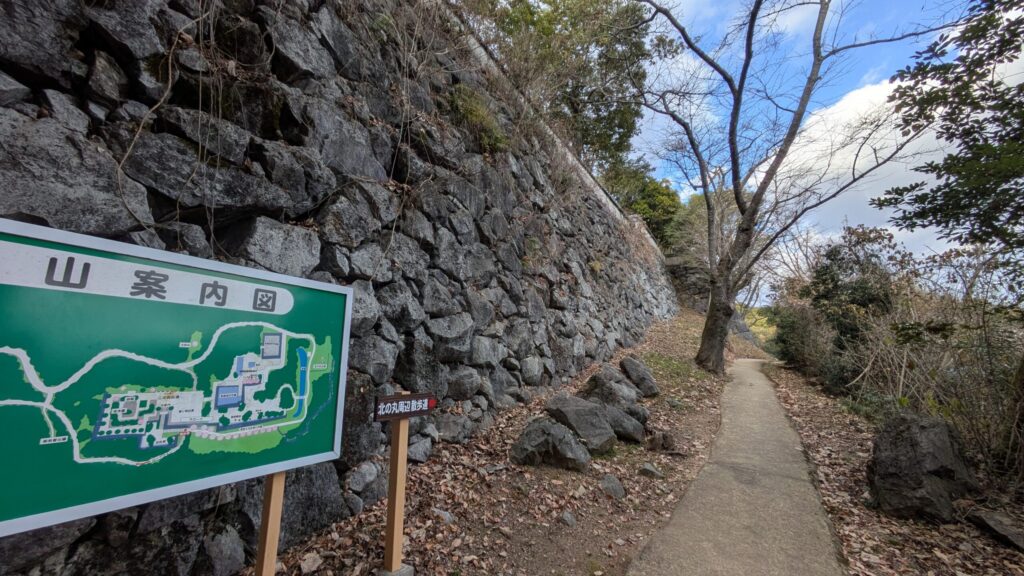 また、岩国城は築城後すぐに江戸幕府の命で破壊されており、築城当時の石垣があまり残されていませんが、石垣に興味のある方は、二の丸から少し降りた位置にある北の丸へ向かう周辺散歩道を歩くと城内に残された高石垣を見ることができます。