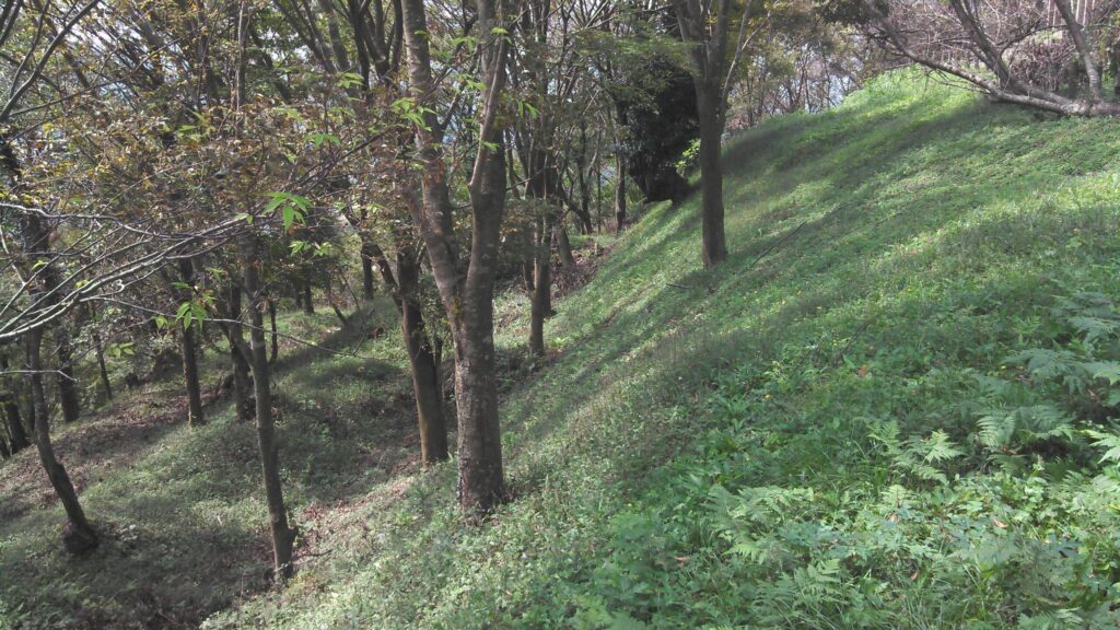 城を構成する基本的な防御施設として、中世の多くの山城では山の斜面の緩い部分を削って崖を造り防御としていました(切岸)。やがてこれに、横堀・竪堀など手が加えられ土塁も構築されていくようになります。最終的には土木技術の発達に伴い、これら防御施設には堅牢な石垣が用いられるようになりました。安土桃山時代になると、織田信長の築城に影響を受けた織豊系の石垣づくりの城が西国を中心に普及していくようになりました。天守のような重い建物を曲輪の際に建てる必要からも、土塁の表面に石材を積んで強化した石垣が発達していきます。