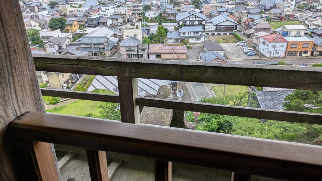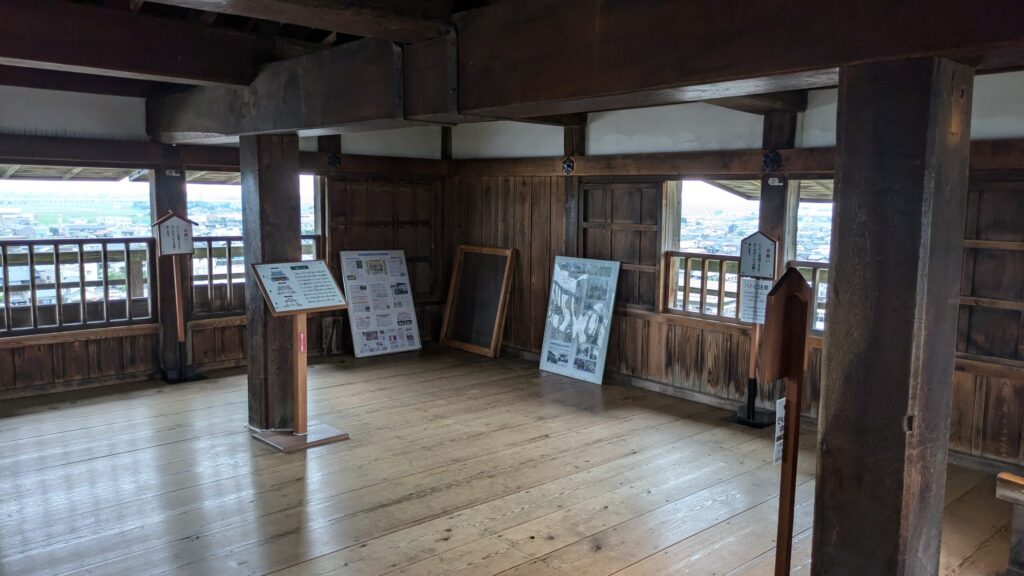 興味深いのは、当初は三階には廻り縁が無く板葺きの腰屋根が巡っていた天守だったことです。年代的には寛永期はすでに望楼型天守の建築は少数派で層塔型天守が主流の時代となっていました。よって、不要な廻り縁を付けないのは理解できますし、板葺きであっても屋根を設けて外観的に三層天守の意匠にしたかったのでしょう。江戸時代に廻り縁高欄付きの天守に改造したため、より古めかしく見え最古の天守と思われやすくなったのは興味深い点です。また、丸岡藩のような小藩でも天守に金鯱が存在するのかということ、天守入り口はやはり単純なものではなく、何らかの防御的な工夫があったということです。