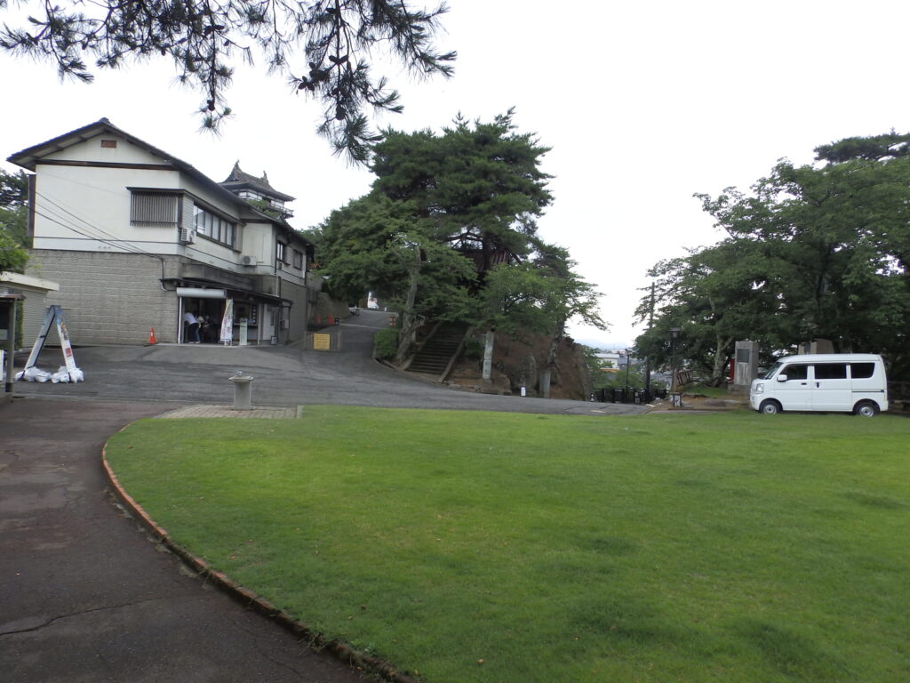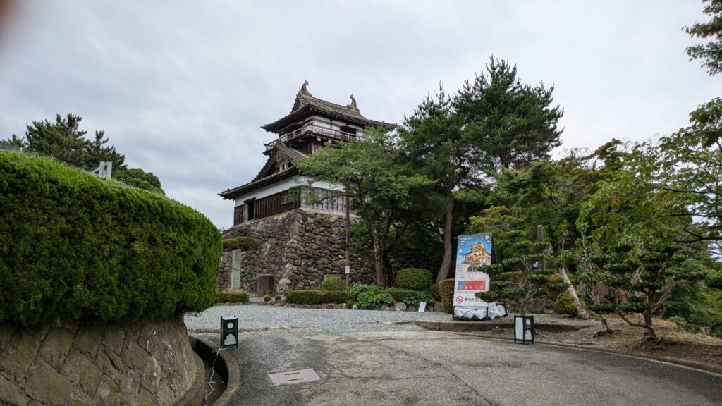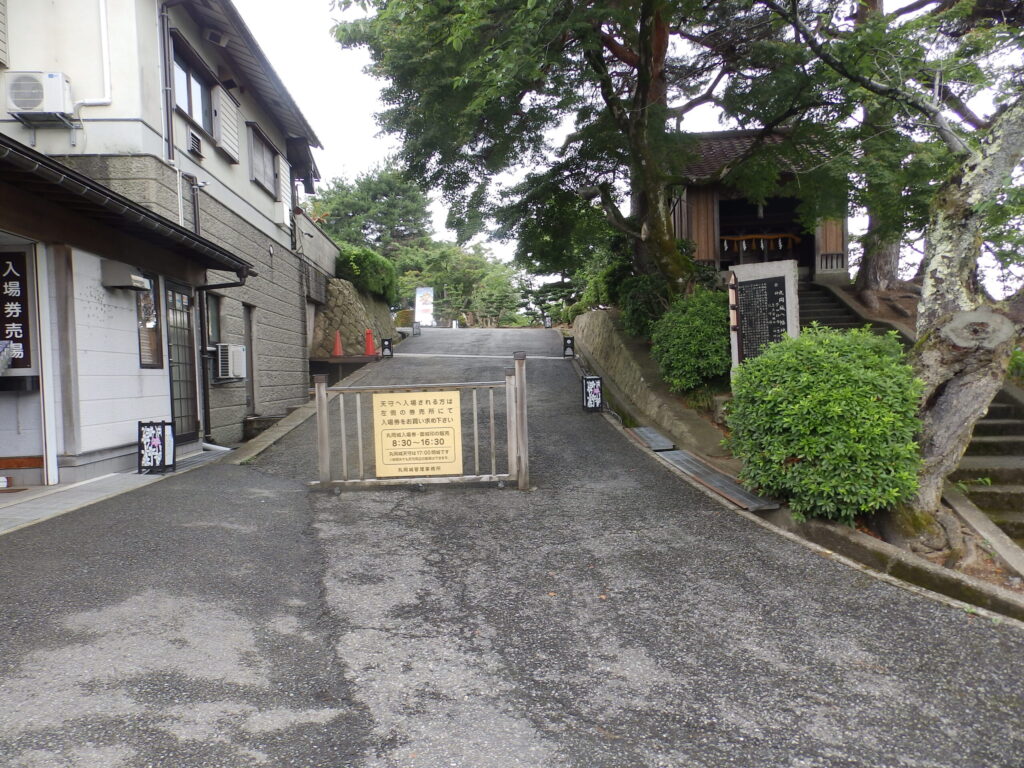 駐車場は広めで入れやすく、そこから天守へ向かう通路の入口横に券売機がありますのでチケットを購入します。坂道になった丘を少し歩くと次第に天守が見えてきます。駐車場から他の曲輪や城門をくぐるような順路でなく、いきなり本丸の天守に向かう感じになるので、広いエリアの他城と比べ、若干コンパクトな印象を受けるかもしれません。