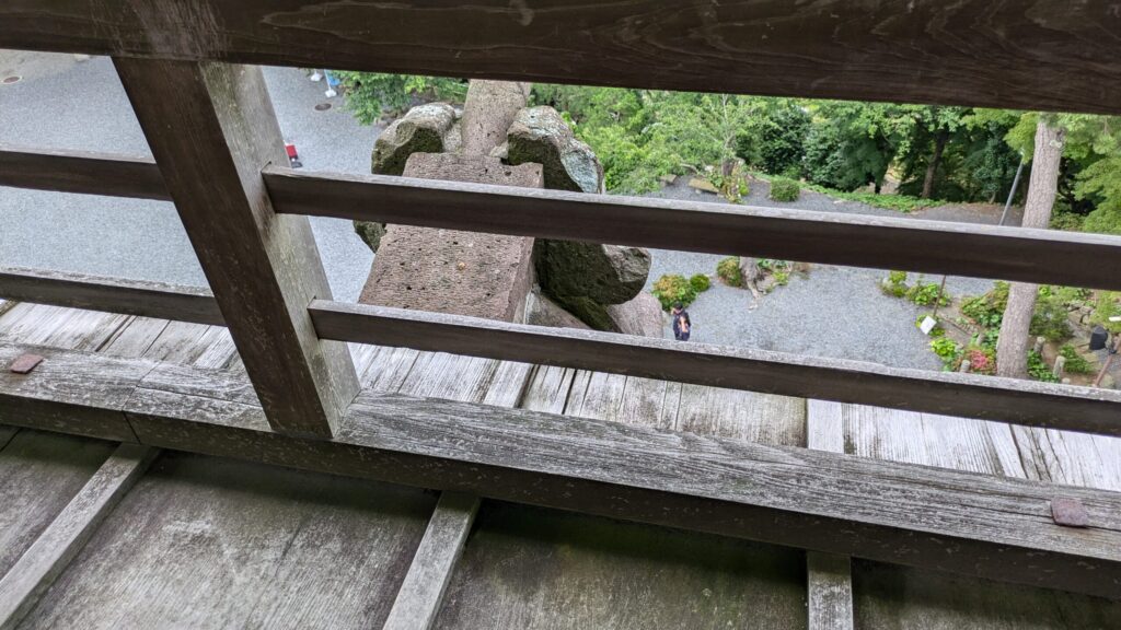 女性及びご高齢の方は上の階に登る天守の階段(写真参照)に注意が必要です。天守台から天守の入り口に上がるところも長い石段があります。急な階段は、登るときは体力がキツイだけですが、降りるときは転落して怪我をしやすいので絶対焦らず気を付けましょう。