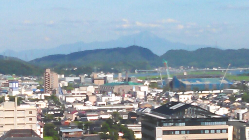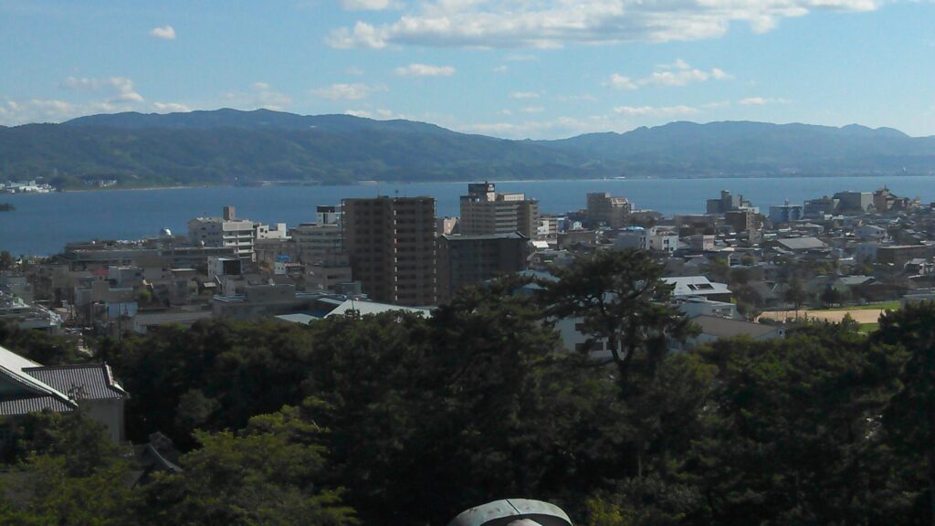 最上階まで登ると、松江城下の展望が開けます。景色として嬉しいのは宍道湖が見えること、遠くに大山の姿も望むことができます。