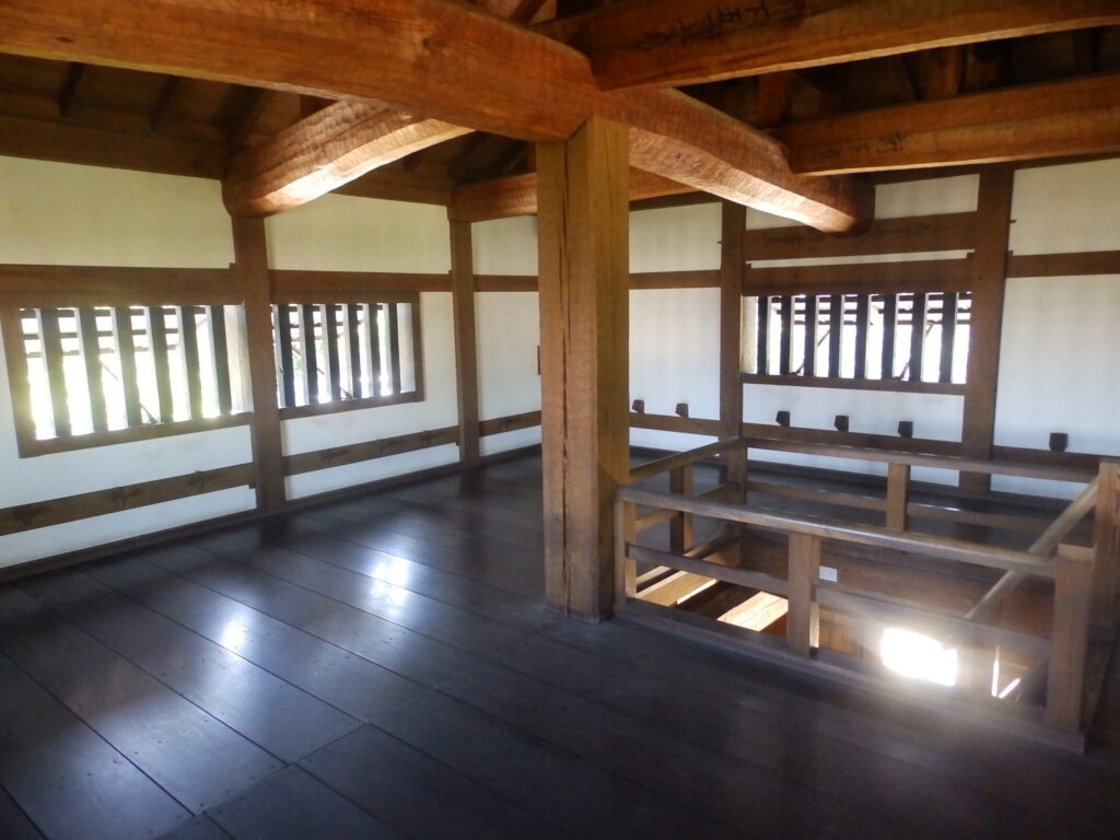 これは前回訪問時は真夏日の昼の暑さで屋外に長く居られず、今回改めて初訪問したものです。3つの櫓(太鼓櫓・中櫓・南櫓)と瓦塀が平成13年(2001)に復元されています。櫓については嬉しいことにどれも無料で中に入ることができました。このうち最大の南櫓をご紹介します。