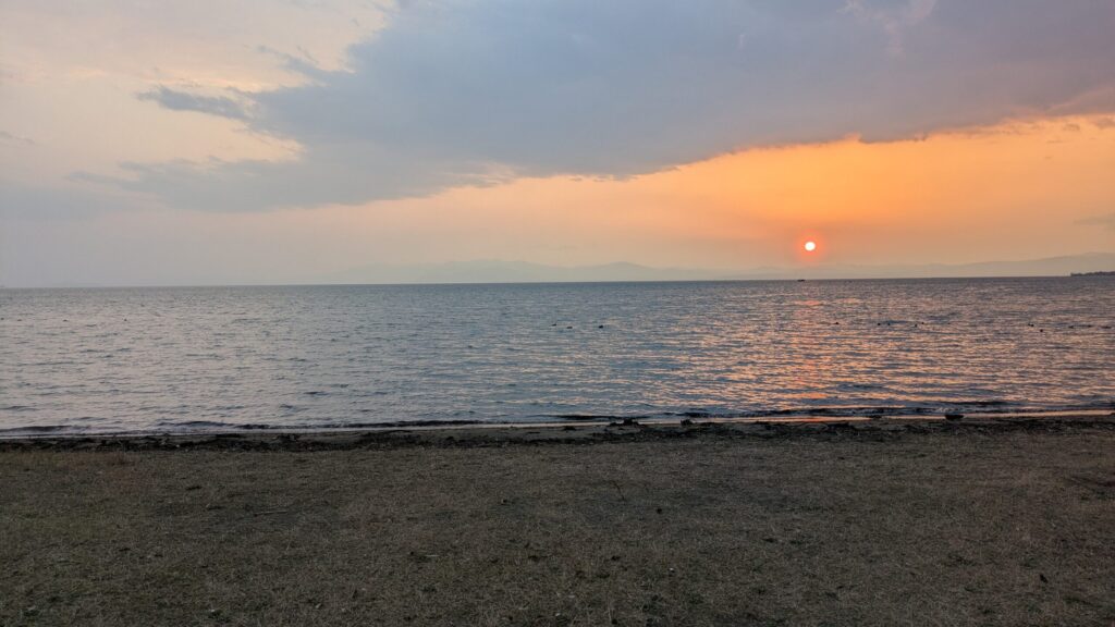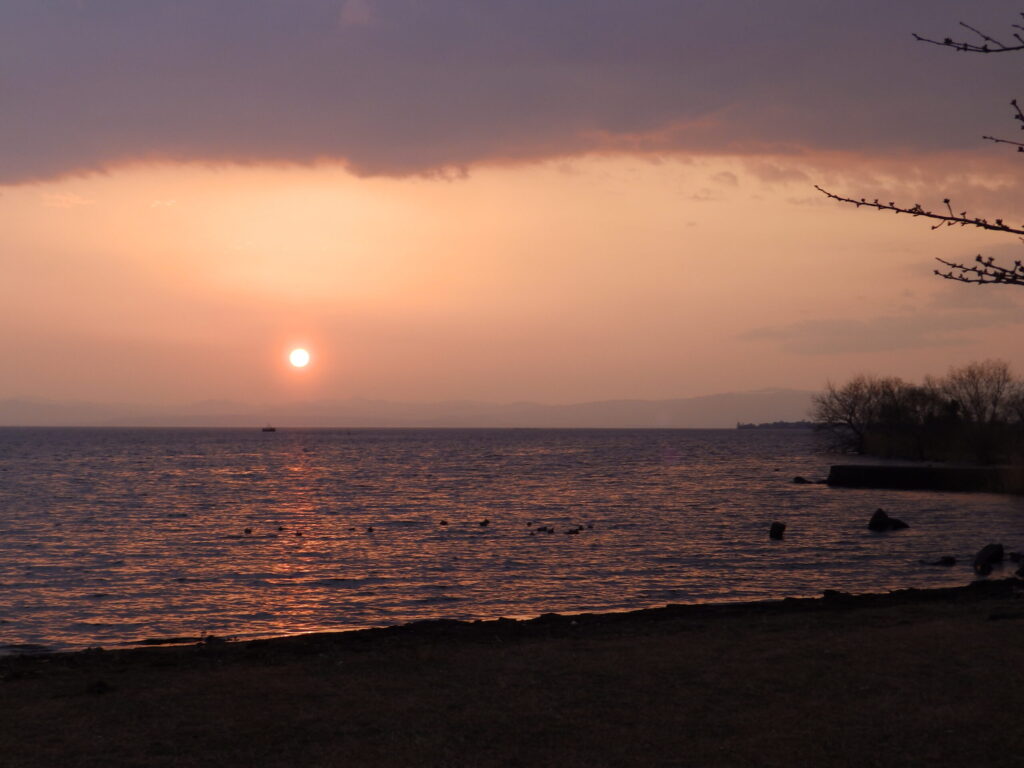 西の空が赤く染まり、琵琶湖の彼方へ太陽がゆっくり沈んでいきます。