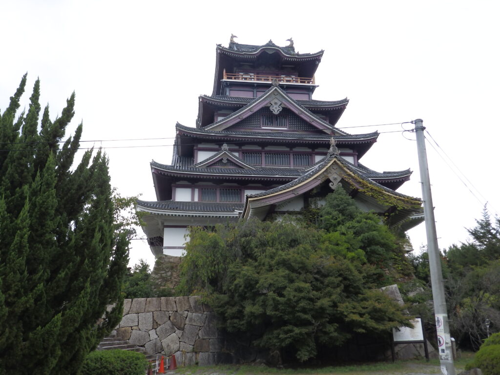 この模擬天守は花畑跡という城域内に建造された観光城です。洛中洛外図池田本に描かれた内容を参考にしているそうですが、初層から最上層まで徐々に逓減し、入母屋屋根の破風、比翼千鳥破風、唐破風の配置が優れています。半世紀前にみたこの天守は、色彩も破風等の細部の造りも丁寧で小天守とのバランスも良く、史実と関係ない模擬天守としては佐賀県唐津城と並ぶ出来の良さだと思っていました。思ったよりは廃墟にならず管理されていましたが、訪問する人もほとんどいません。かつての遊園地があった賑わいとは別世界で、現在社会の栄枯盛衰の時の流れを感じます。