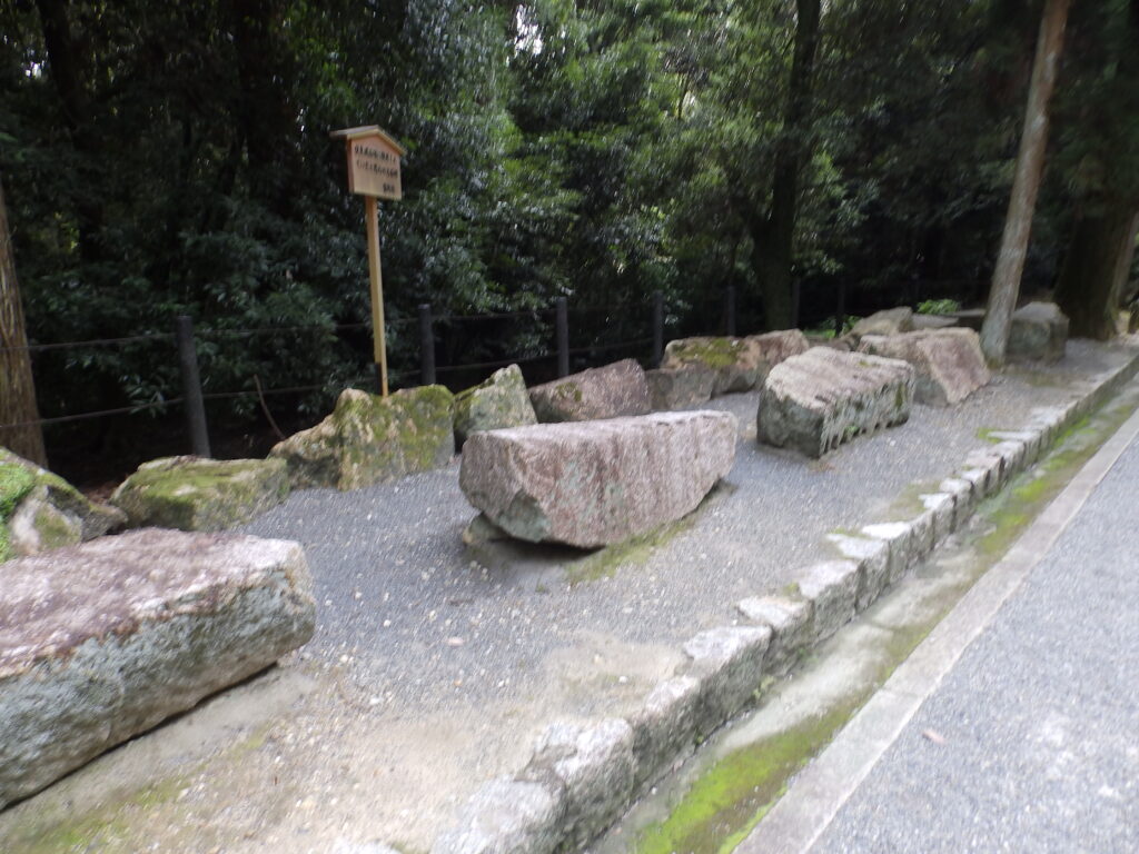 途中、へばって脱水症状を起こしたのかふくらはぎを攣ってしまい、同行者の方に心配をかけながら休息をとります。スポーツ飲料で水分補給には気を付けていたつもりでも、朝から奈良県郡山城訪問からの強行軍で、体力を使っていたようです。 参拝道の途中、この場所に伏見城があったことを偲ばせる石垣用石材が展示されています。写真をとりつつ、やっと御陵にたどりつきました。