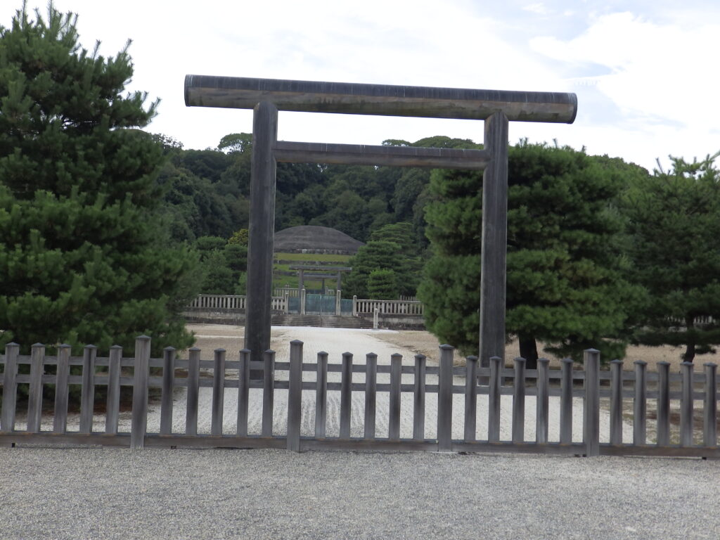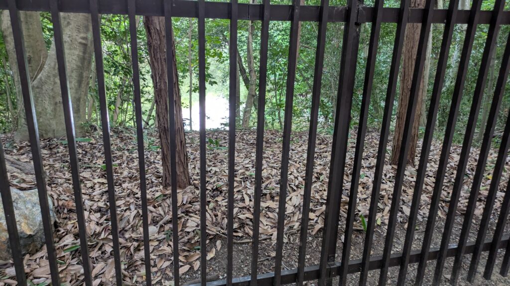 ここまで伏見城模擬天守のある運動公園駐車場から歩いてくるのに、15分以上あります。夏場では結構な体力と時間を使います。静かな参拝道を歩き進むわけですが、宮内庁の管理地側すなわち伏見城側を木々の間から様子見します。崖地が確認されると郭の外縁・堀切跡かと思うわけですが確認できません。