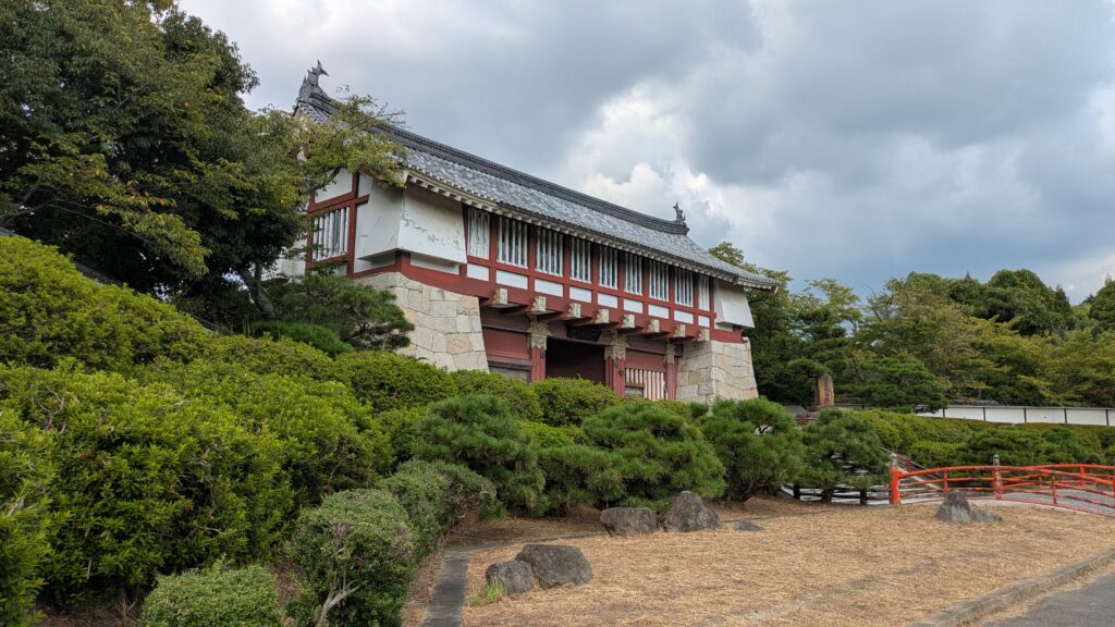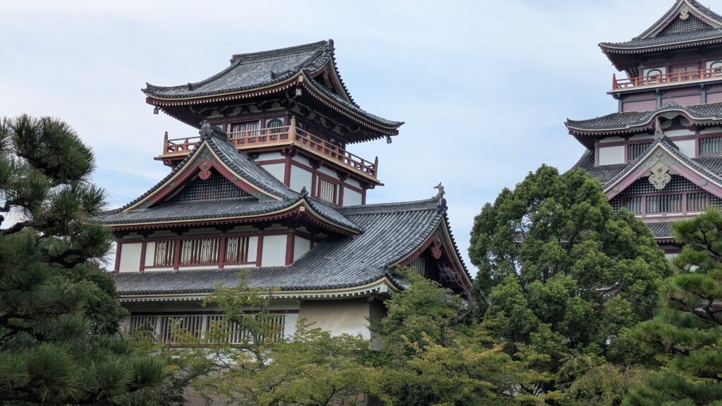 9月上旬午前に最初の目的地 大和郡山城を訪問後、近鉄郡山駅に戻り電車で北上します。次の目的は旧伏見桃山城キャッスルランドの「伏見城天守閣」です。訪れるのは約45年ぶりになります。電車で伏見駅まで着いたところで、行き過ぎたことに気づいて桃山御陵前に戻り下車します。駅横のラーメン屋さんで豚骨スープのラーメンをいただき、伏見桃山城に歩いて向かいます。