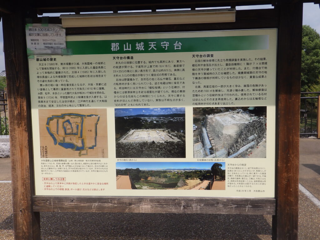 この天守台の説明文で気になるところがあります。「天守台の構造」で上面の広さは約16m×18mとあります。一方で天守台の発掘調査では7間・8間規模の建物が建っていたとあります。郡山城の1間幅が正確にわからないものの、180センチ位とすれば建物と石垣の端部では1間~1間半くらいの隙間が出てしまいます。天守台の年代は豊臣時代であることは、ほぼ発掘調査でも証明されているようです。いずれにしても7間・8間規模なら三重または四重天守でも不自然でなく、五重天守だったとすれば、かなり小ぶりな五重天守だったということになります。