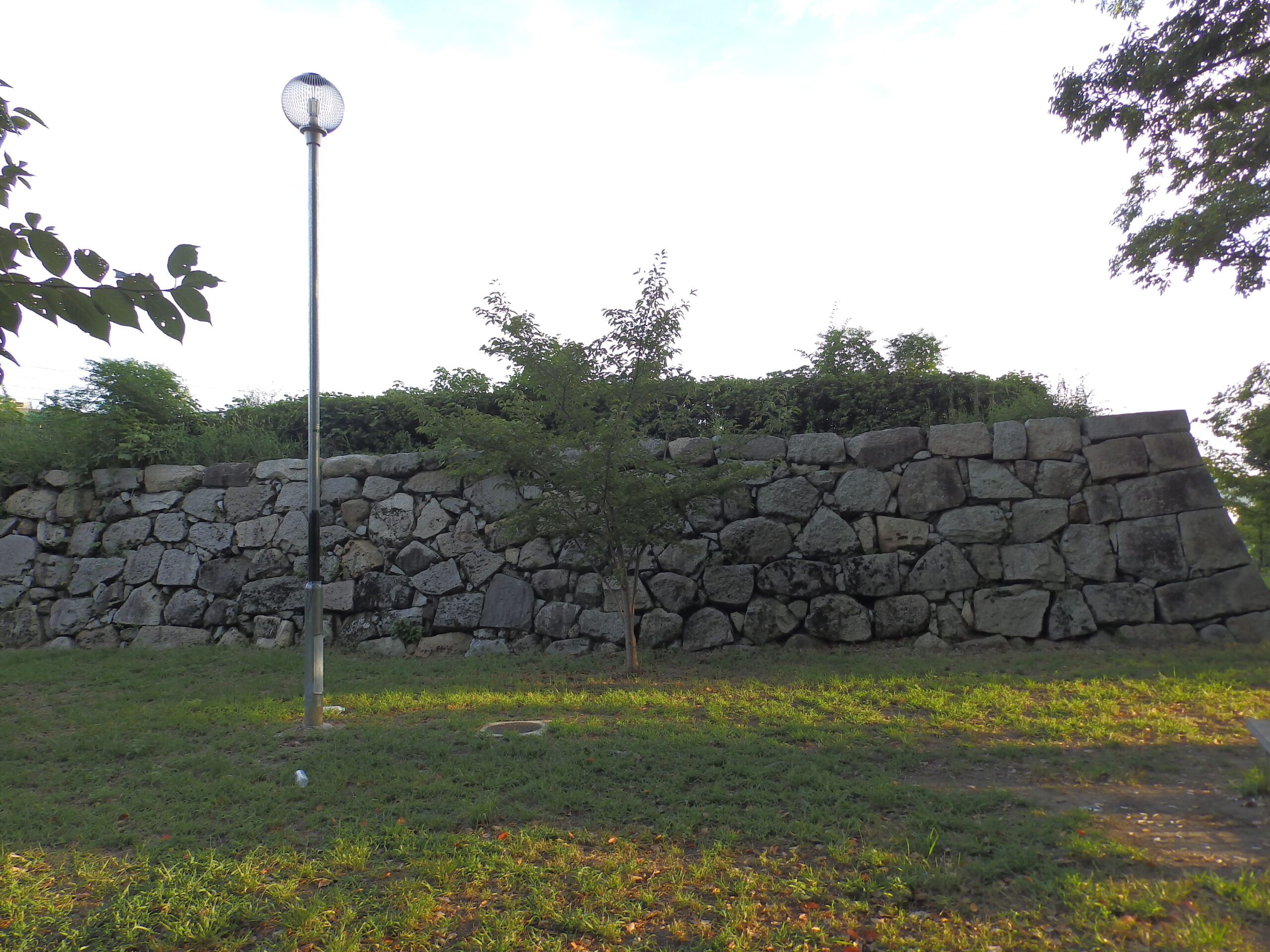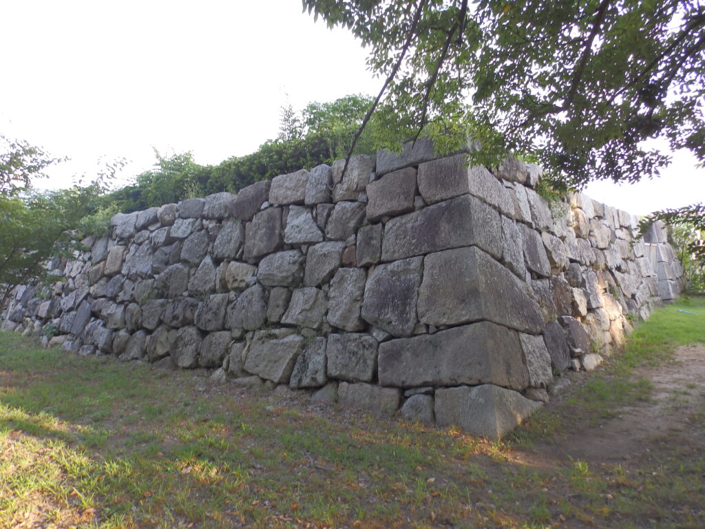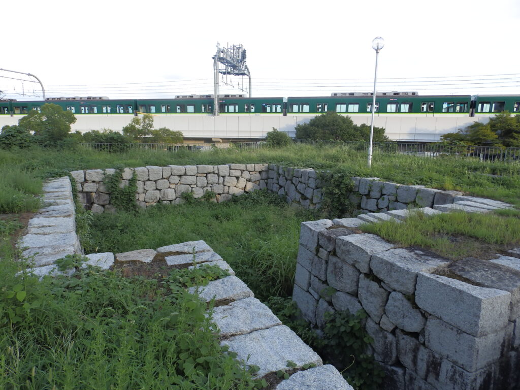 伏見桃山御陵では汗だくになったため、電車の中では周囲に汗臭く嫌われてないか、気になりながら電車を下車しました。京都競馬場を背に左側(西側)に二~三〇〇メートル歩くと城址公園があります。すぐに本丸天守台に到着しますので、河川を利用した平地にある城ということを実感します。城址公園では本丸の石垣と堀を見ることができます。